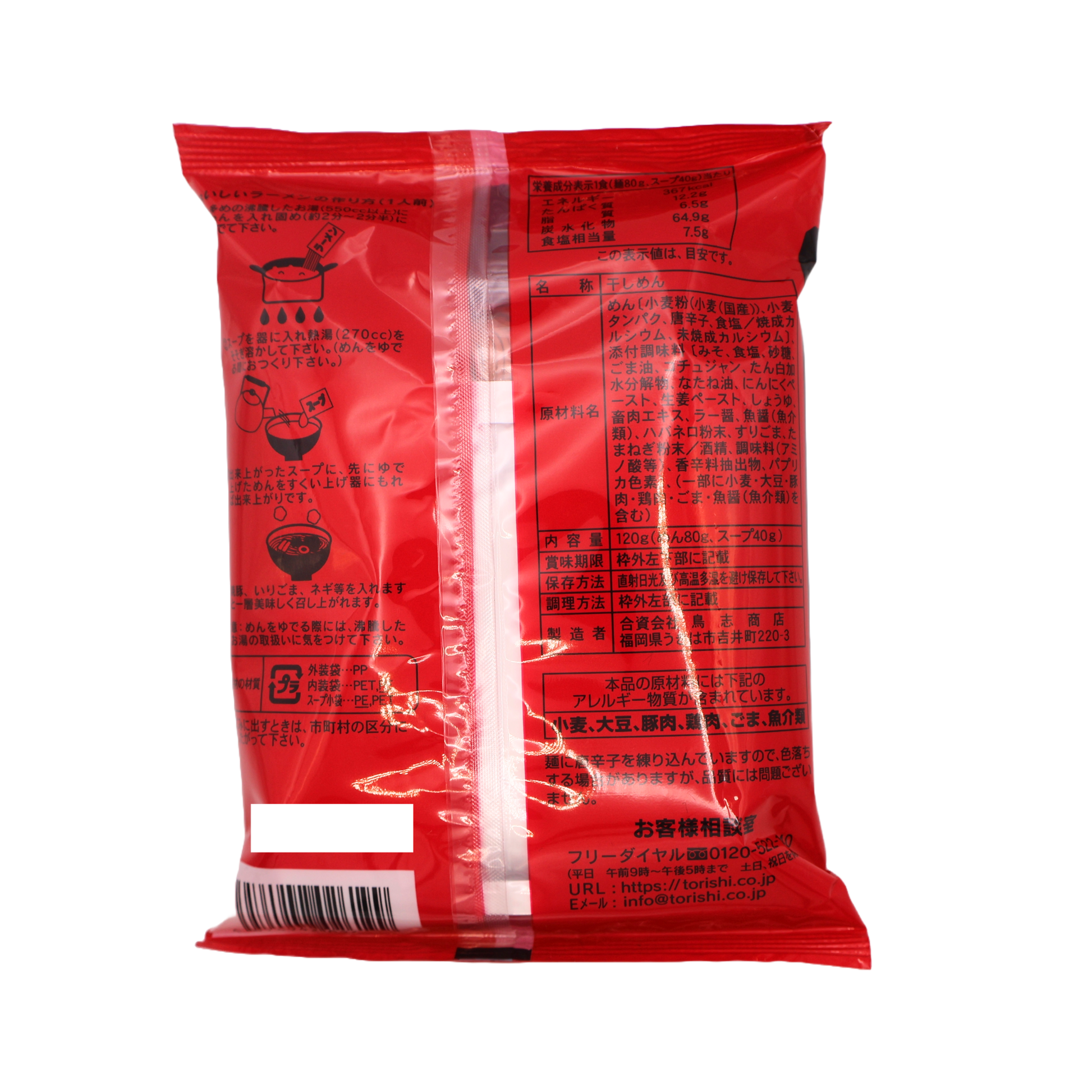 1食(麺80g スープ40g)あたり エネルギー:367kcal、たんぱく質:12.2g、脂質:6.5g、炭水化物:64.9g、食塩相当量:7.5g(推定値)