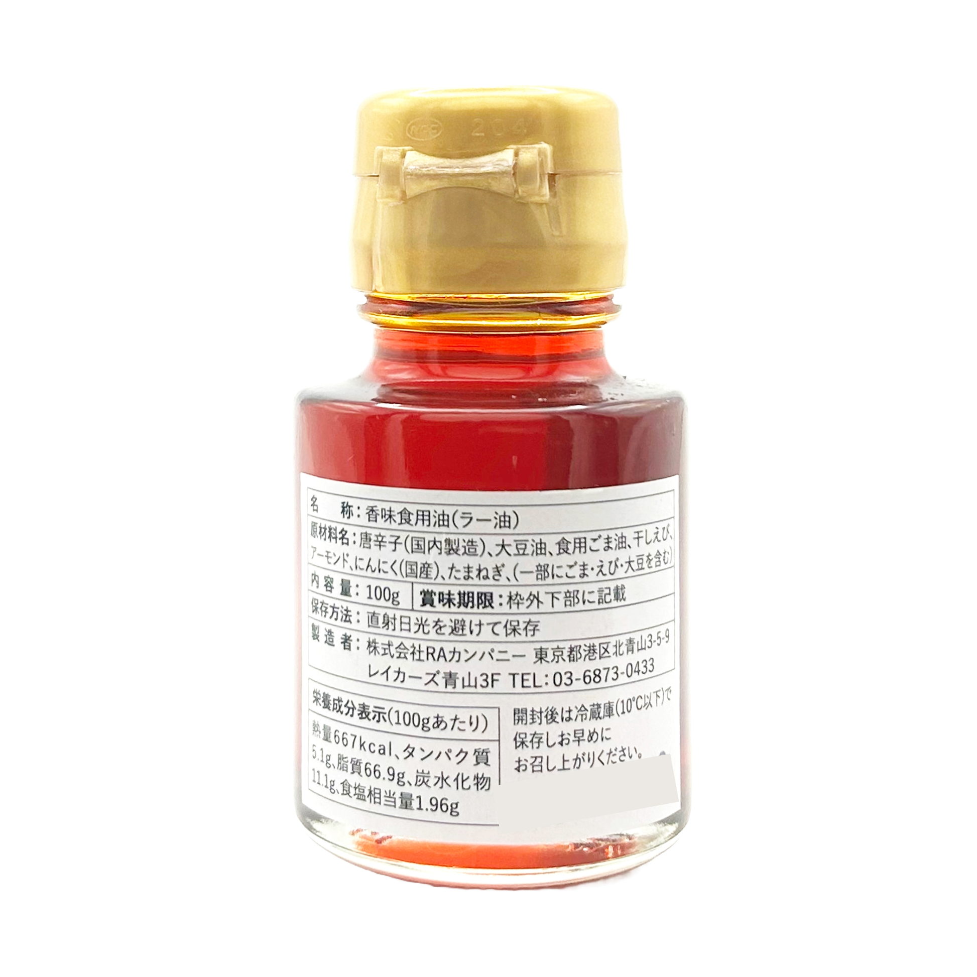 唐辛子(国内製造)、大豆油、食用ごま油、干しえび、アーモンド、にんにく(国産)、たまねぎ、(一部にごま・えび・大豆を含む)